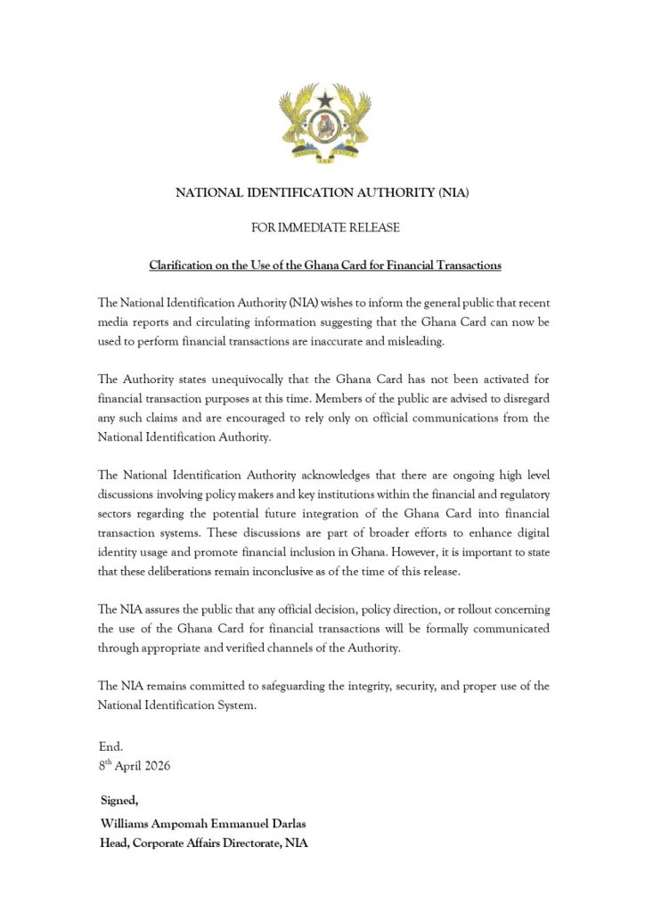 “The Authority states unequivocally that the Ghana Card has not been activated for financial transaction purposes at this time,” the document reads. “Members of the public are advised to disregard any such claims and are encouraged to rely only on official communications from the National Identification Authority.”