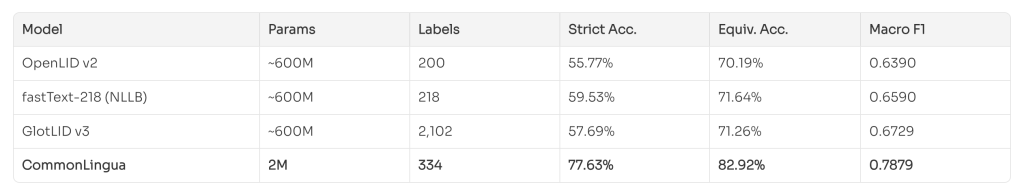 The model runs at just 2 million parameters, ships as an 8MB file, and still outperforms systems that are up to 300 times its size. On the newly released CommonLID benchmark, it achieves 83% accuracy and a macro F1 score of 0.79 — more than 10 percentage points ahead of competing models under comparable testing conditions.